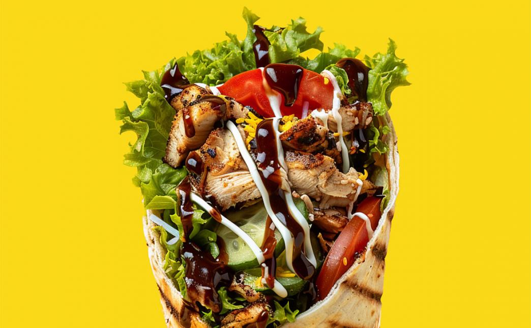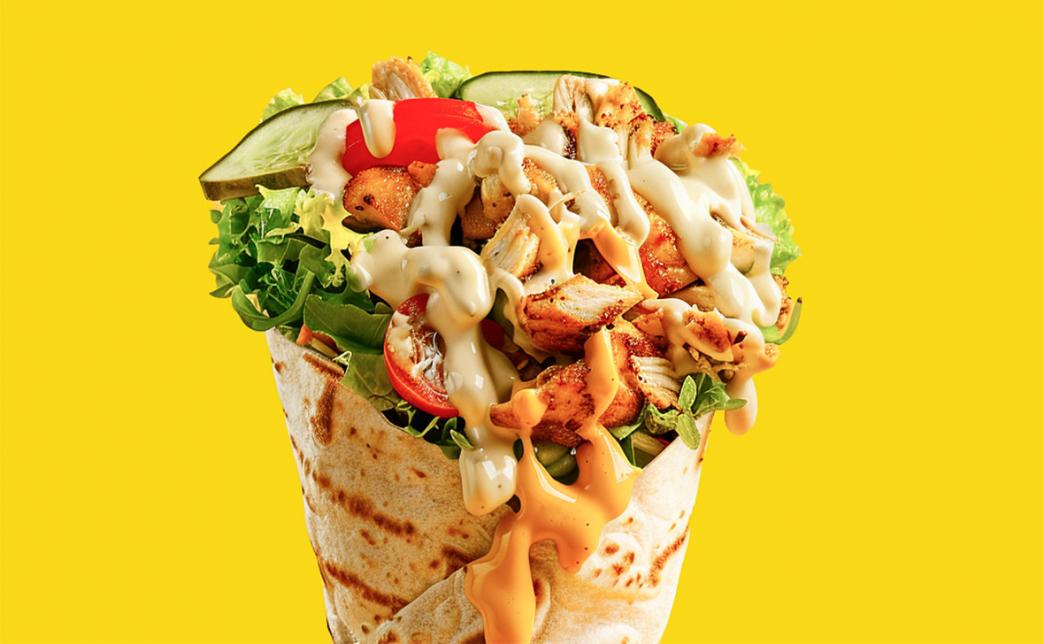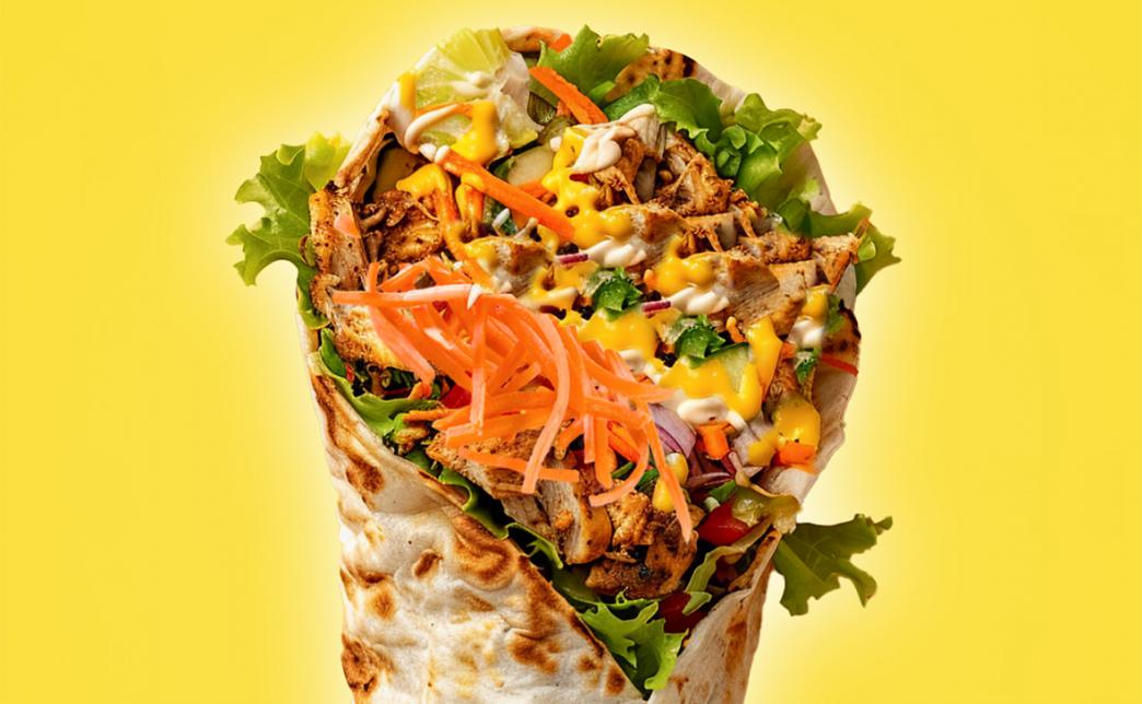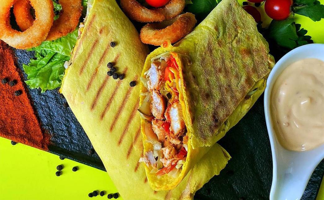 Состав: лепешка сырная, капустный салат, свежий помидор, маринованный огурец, курица, картофель фри, лук маринованный, соус чесночный, соус горчичный