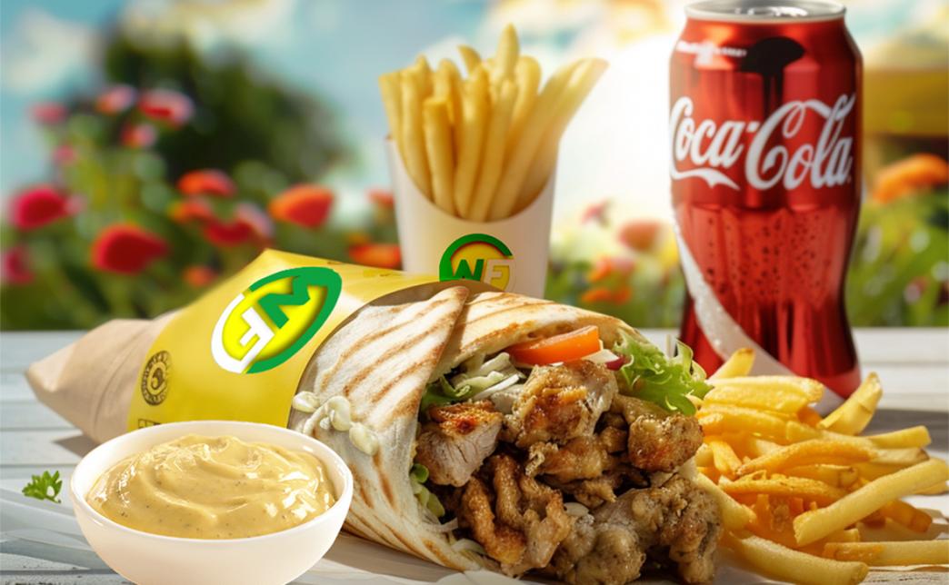 Комбо №1013 (450 г) 15,90 р. 31,80 р. Состав: - донер "Гриль" (320 г) - картофель фри (100 г) - соус (30 г) - кока-кола (330 мл)