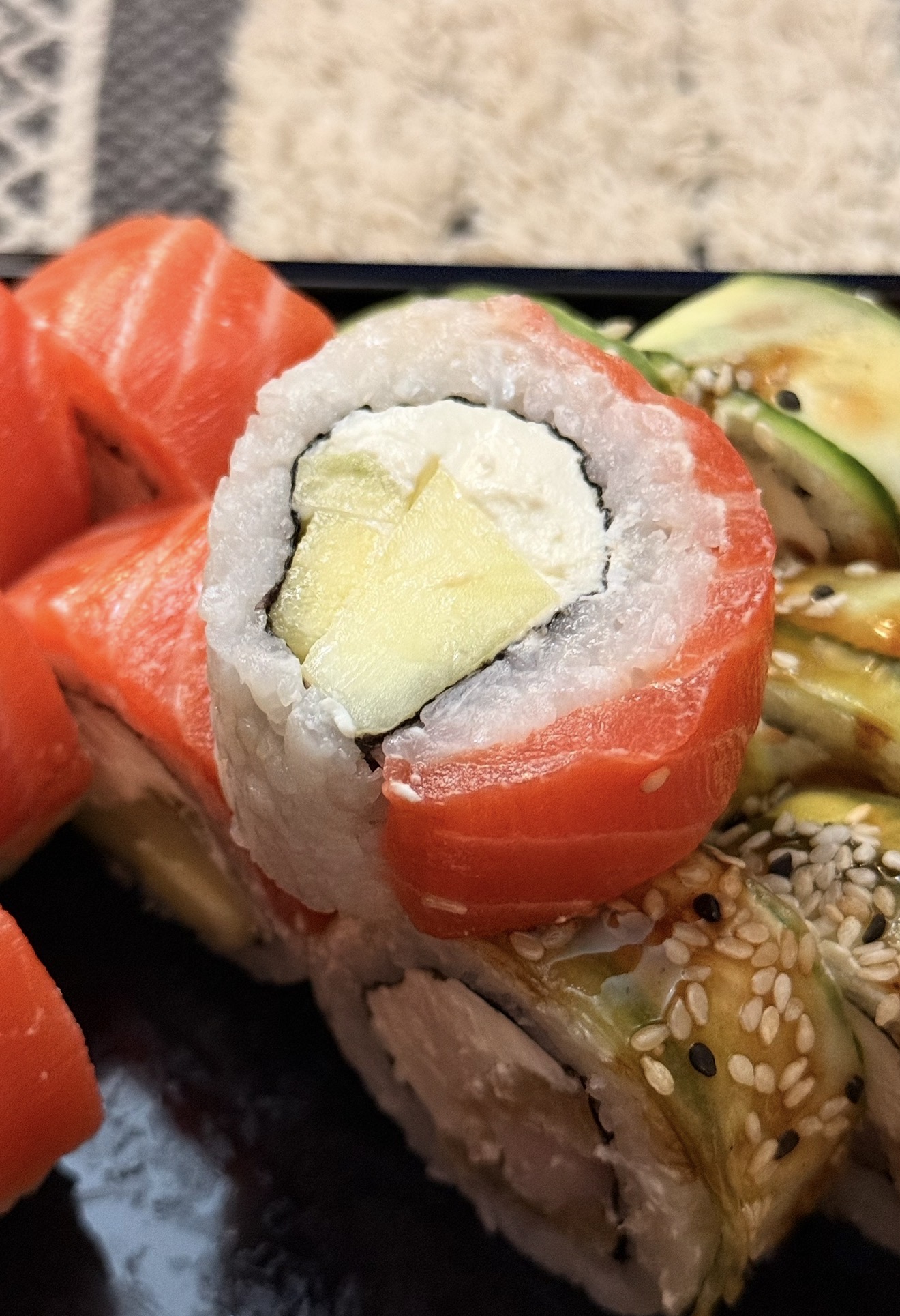 Часто тут заказывали, и в основном берём сет «Ирония судьбы», и сегодня его заказали; но привезли Филадельфию с твердым, зеленым и кислым манго. Можно же позвонить и предложить не добавлять его или на огурец заменить. Есть в итоге невозможно.