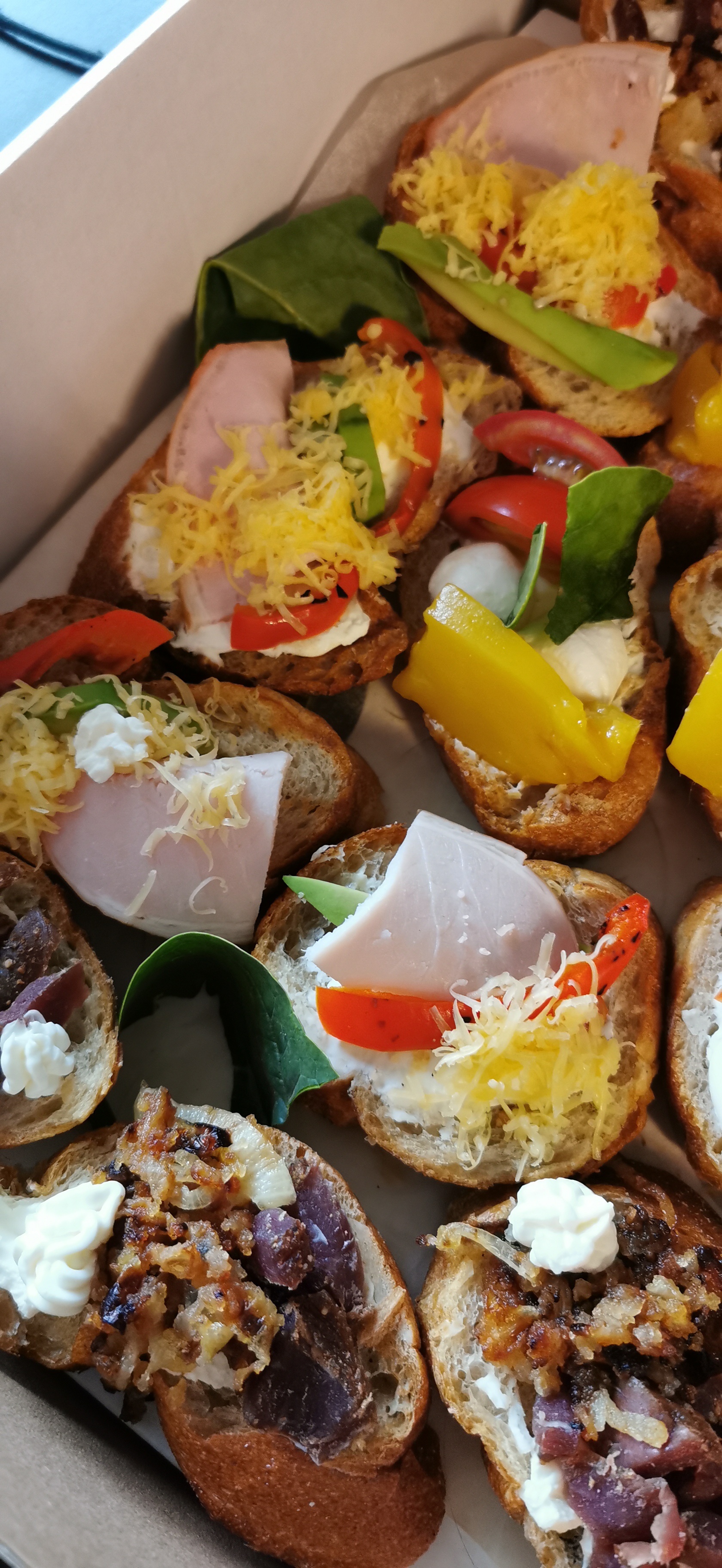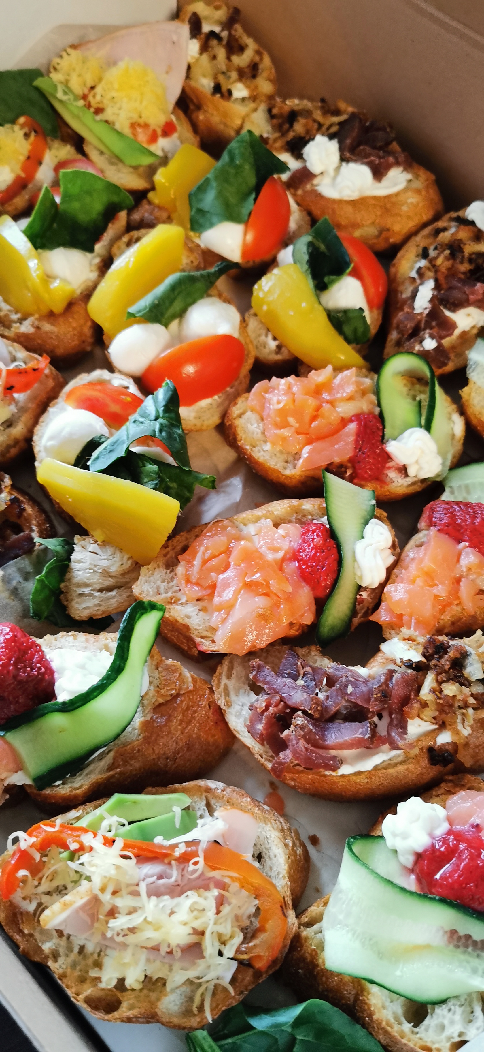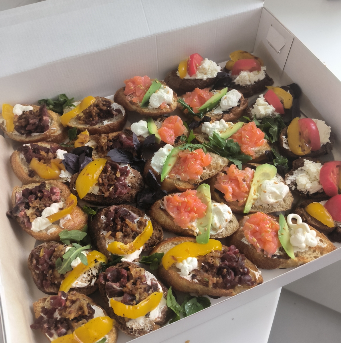 Состав: хрустящая брускетта, тартар из лосося, авокадо, зелень, творожный сыр, перец на гриле, вяленый томат, вяленое мясо, шампиньоны, салатная паста