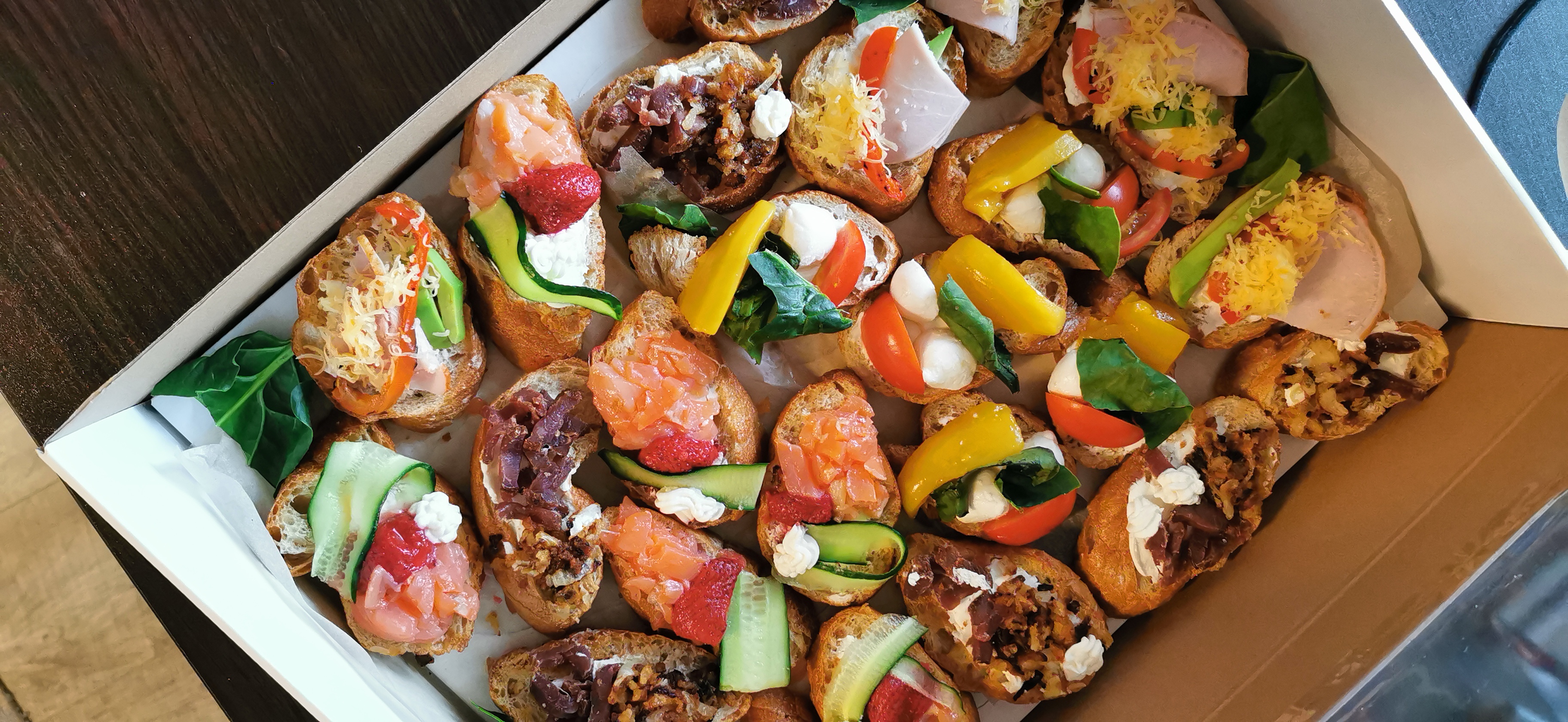 Состав: брускетты с вяленым мясом, сыром, томатами, клубникой, персиком, авокадо