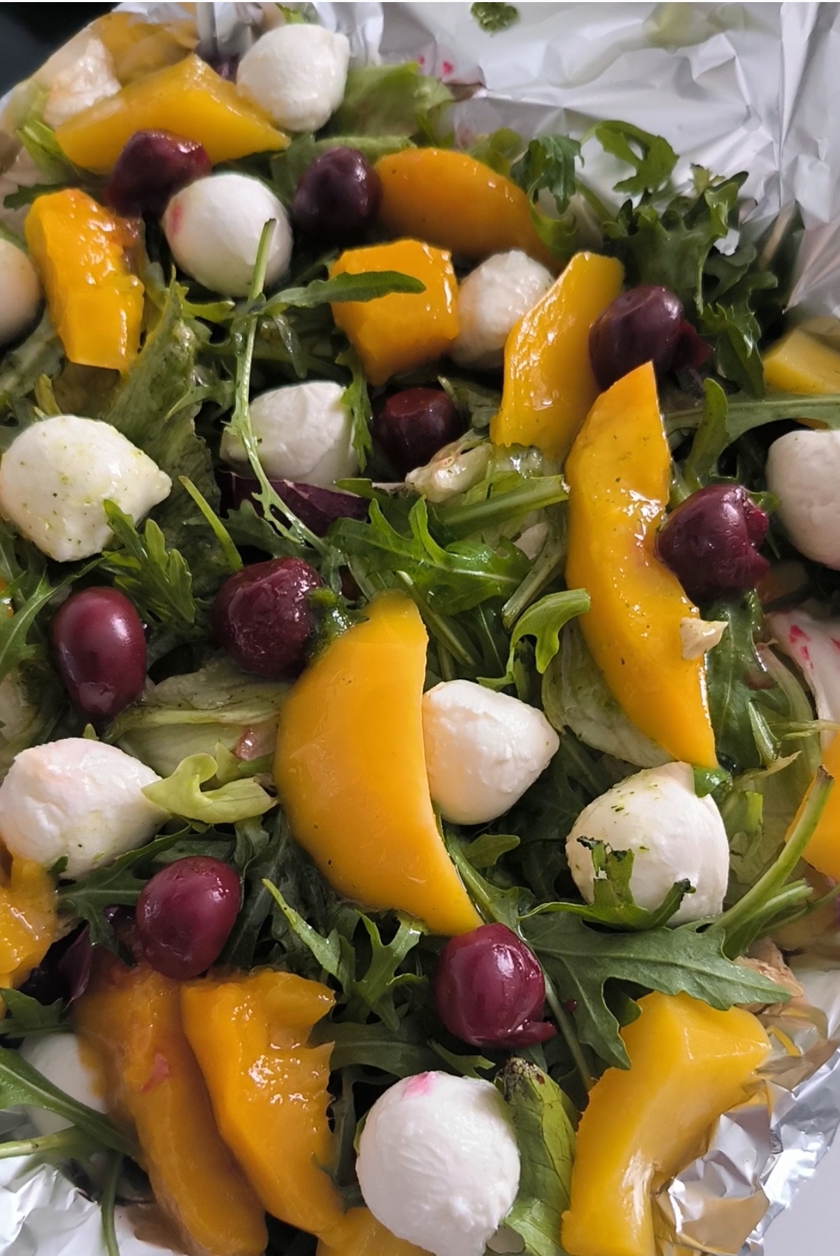 Состав: руккола, базилик, персики, моцарелла, вишня, соус