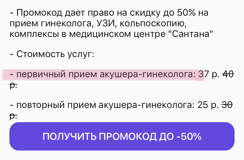 - Промокод дает право на скидку до 22% на прием гинеколога, УЗИ, кольпоскопию, комплексы в медицинском центре "Сантана"