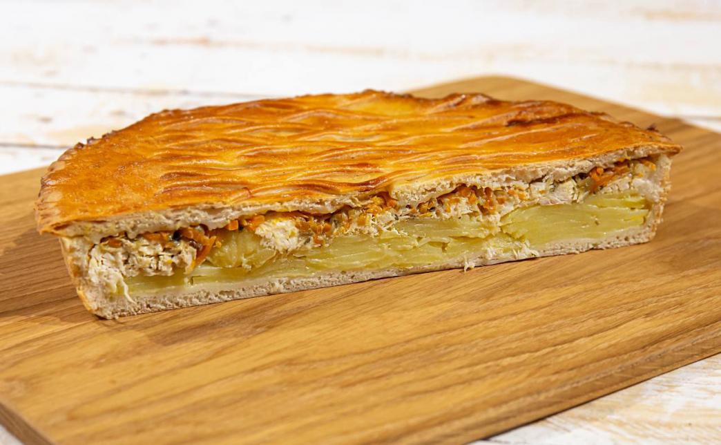 - пирог "С картофелем и курицей" (1200 г): дрожжевое тесто, картофель, куриная грудка, морковь, лук, соль, чеснок, черный перец