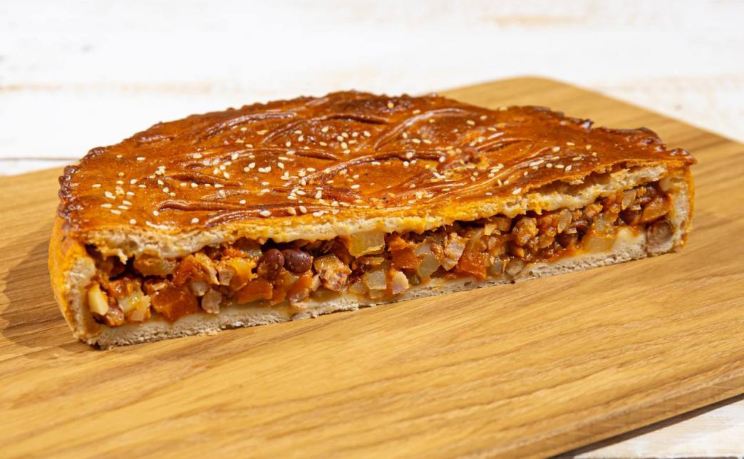Состав: дрожжевое тесто, фасоль, морковь, лук, картофель, бекон, черный перец, соль, чеснок