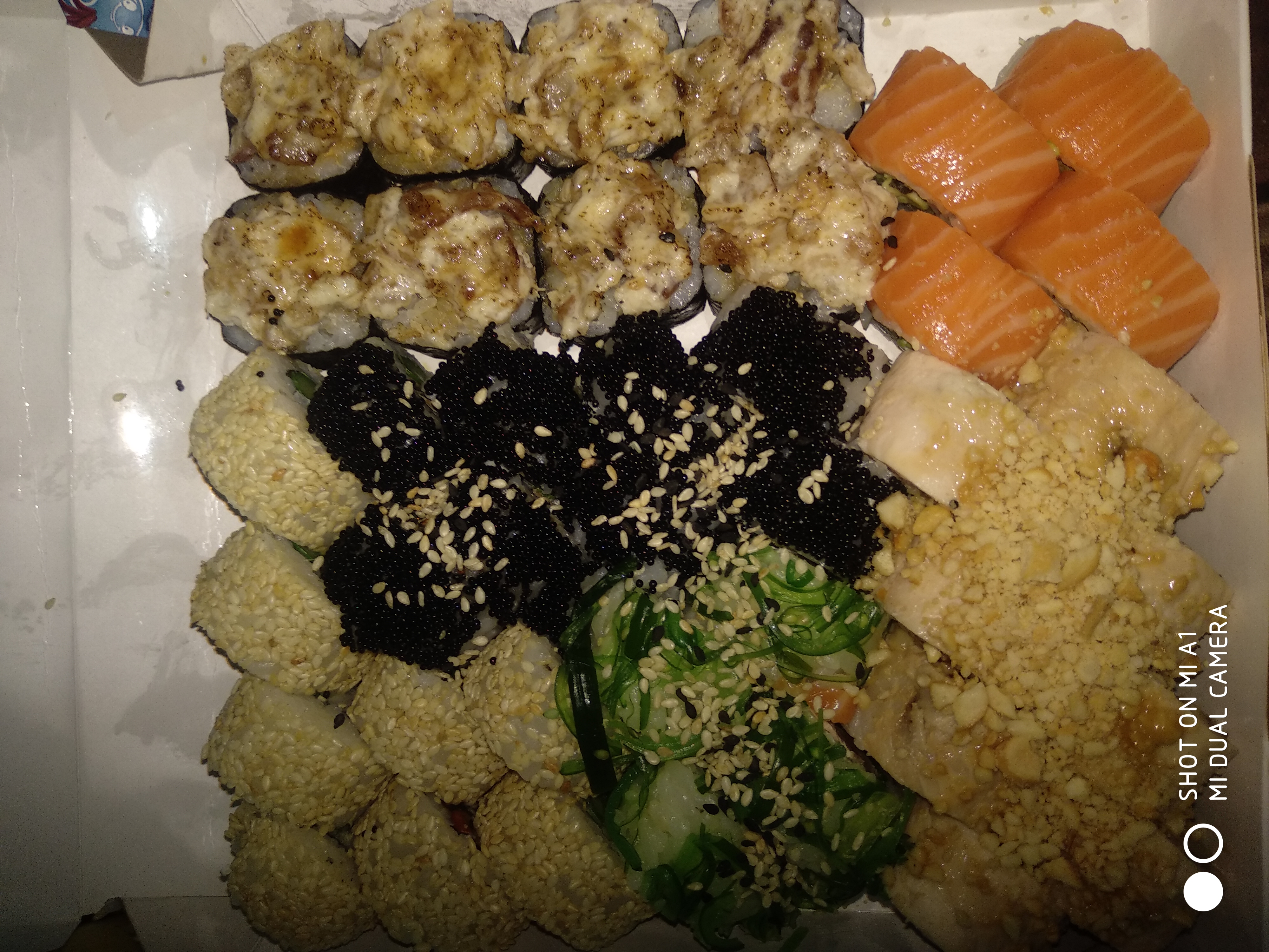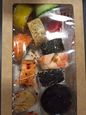 - "Ролл с лососем и манго в кунжуте": филе лосося, сливочный сыр, салат айсберг, манго, кунжут, кешью - 8 шт.