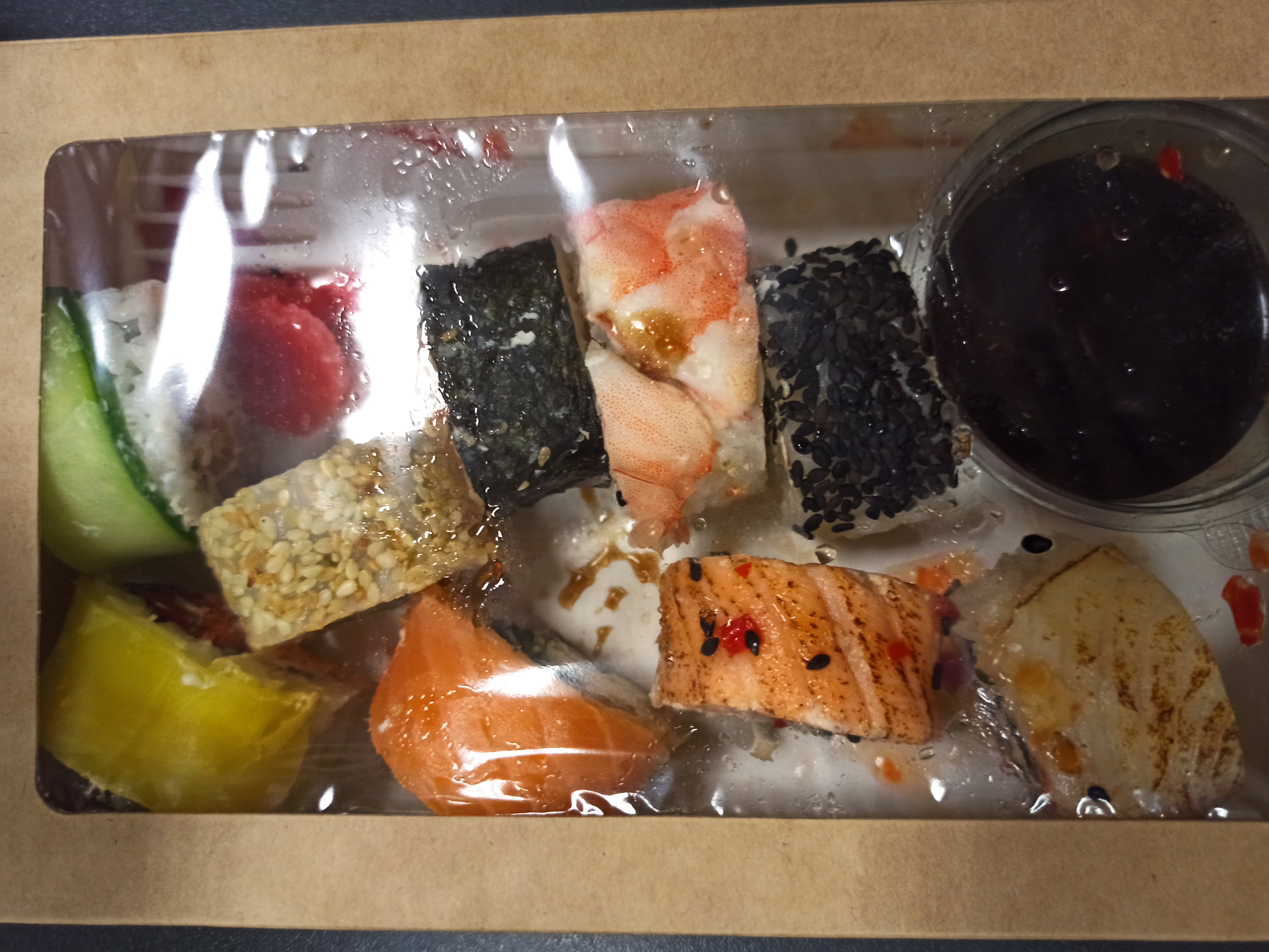 - "Брайтон": филе тунца, сливочный сыр, такуан, огурец, лук зеленый, соус пряный, соус терияки, орехи кешью - 8 шт.
