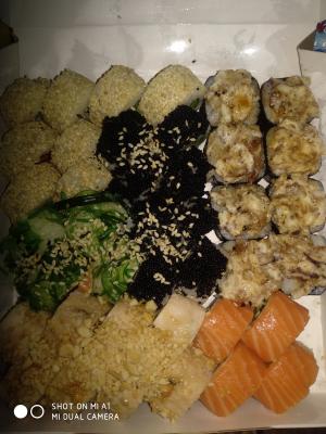 - "Хотсити": жареный морской окунь, сливочный сыр, огурец, омлет тамаго, сырный соус, нори, соус терияки - 8 шт.