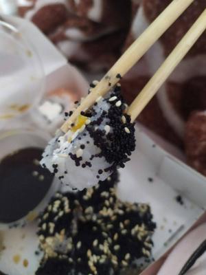 - "Ролл с жаренным окунем и ореховым соусом": жареный окунь, сливочный сыр, огурец, кунжут, соус ореховый - 8 шт.