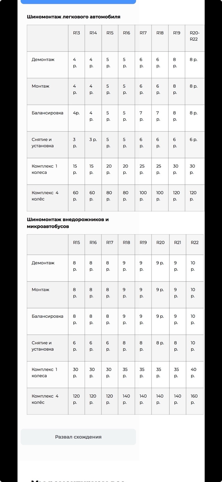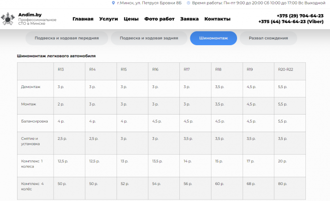 - В стоимость комплекса по системе "Все включено" входит: снятие/установка колеса, разборка/сборка колеса, балансировка колес, грузы (набивные и клееные, сколько нужно), вентиля (по необходимости), герметизация (герметик бортов по необходимости), чистка дисков, чистка и смазка ступиц (по необходимости), пакеты для упаковки шин