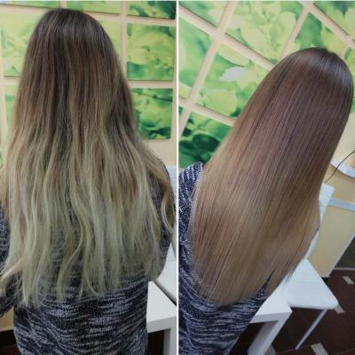 На внешней поверхности волоса молекулы кератина восстанавливают поврежденную кутикулу, благодаря чему чешуйки волоса приглаживаются и волосы становятся более ровными по текстуре, приобретают сияющий блеск и здоровый внешний вид.