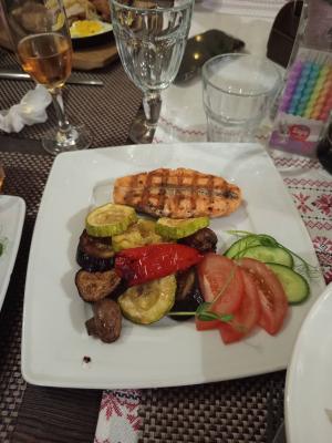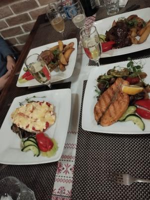 Салат "Цезарь" с семгой (200 г) - 1 порция Салат "Фирменный" с говядиной (200 г) - 1 порция Щеки говяжьи с картофелем по-деревенски (300 г) - 1 порция Стейк из семги с овощами-гриль (300 г) - 1 порция Десерт (на выбор, 150 г) - 2 порции Игристый напиток (750 мл) |